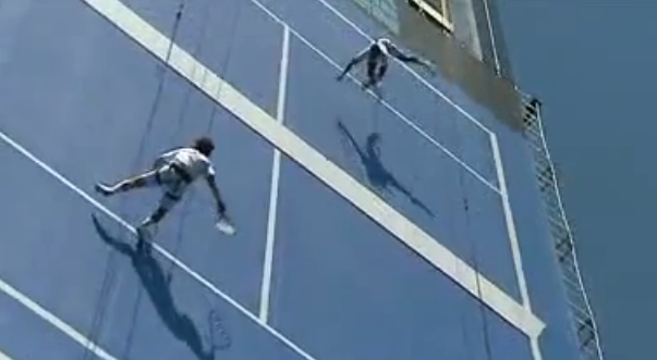 Dos equilibristas juegan un partido de tenis en vertical sobre la fachada de un edificio del Paseo de la Castellana de Madrid.