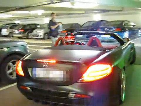 Un turismo Mercedes SLR a 150 km/h por un parking público.