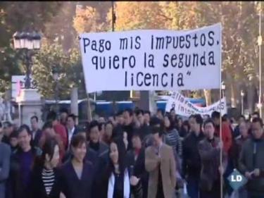 Varios cientos de comerciantes chinos se ha concentrado este lunes ante el Ayuntamiento de Madrid, en la que es la primera movilización de este colectivo en España, para pedir que se les conceda la denominada "segunda licencia", que permite vender alcohol, y no sea "discriminados" con respecto a otros vendedores.