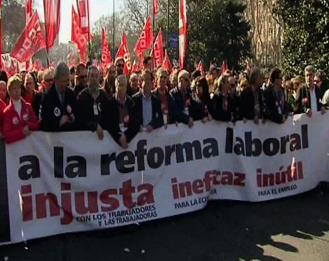 Miles de personas han recorrido las calles de Madrid protestando contra la reforma laboral. Ha habido gritos a favor de la huelga general.