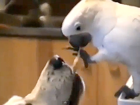 Bonita imagen de un loro alimentando a un perro, al más puro estilo "La Dama y el Vagabundo".
